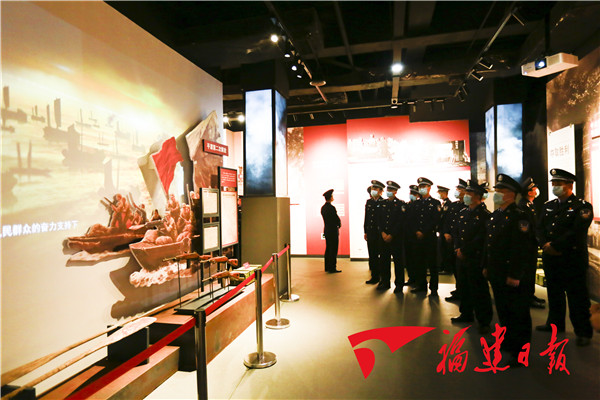 民警在平潭综合实验区主题党日馆内重温辉煌党史。
