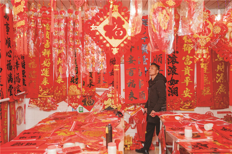 “吉祥如意”“恭喜发财”“欢度佳节”……位于老城区的海坛步行街是平潭有名的商业区,许多商家门口都挂起了大红灯笼,而街区上空也被挂着红色小国旗和小灯笼的彩绳所点缀。这里,以春节为主题的陈设装扮,以“虎”元素居多,成为新年饰品专区的“主旋律”。