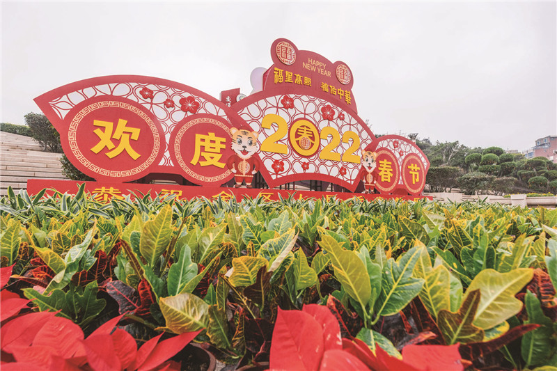 在万宝公园等地,虎年装饰、鲜花、绿植,组合设置成景观小品,为市民游客营造出红红火火、喜庆热烈的节日氛围。