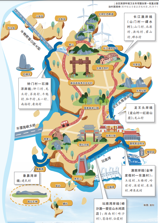期间,同步开展绿化花化、卫生保洁、硬件设施、“大美平潭文明有爱”四个专项整治行动,冲刺提升全区旅游环境卫生水平。“截至3月8日,全面排查各路段、公园等场所的绿化问题,发现问题51处,整改8处。完善道路硬件设施,发现问题20处,整改9处。”实验区宣传影视部文明处工作人员林辉说。