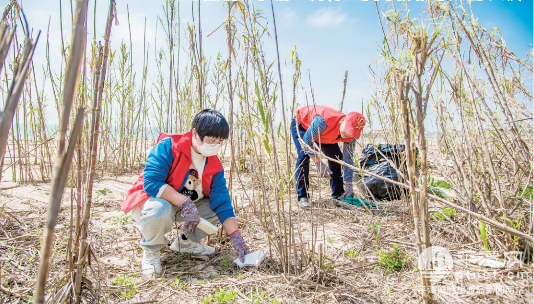 志愿者正在清理海滩巨菌草防护带里的垃圾