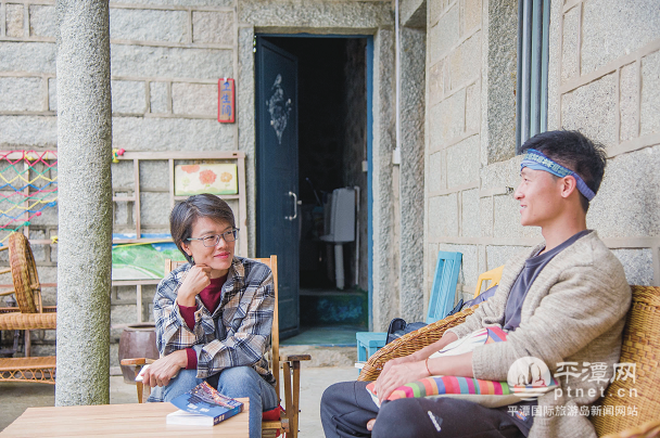 毛秀娟(左)在给外地的朋友讲解平潭的美丽风景 融媒体记者 林君斌 摄