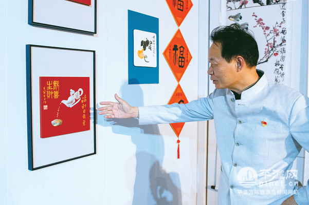 在馆内一角,白色墙壁上,近十幅红底白框的福文化创意挂饰格外吸睛。