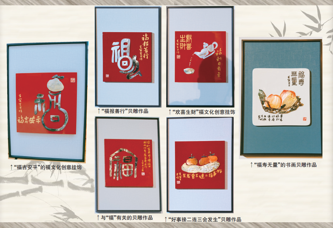 据詹立新介绍,这些创意挂饰主要采用加工打磨的蚌壳、黑碟贝和黄碟贝等贝类作为装饰主原料。“贝壳是‘海洋精灵’,用笔墨与其相融合,是这个福文化创意挂饰的精髓所在。”詹立新说,挂饰一经发布,备受市场好评,成为平潭贝雕的热销文创产品,远销省内外。