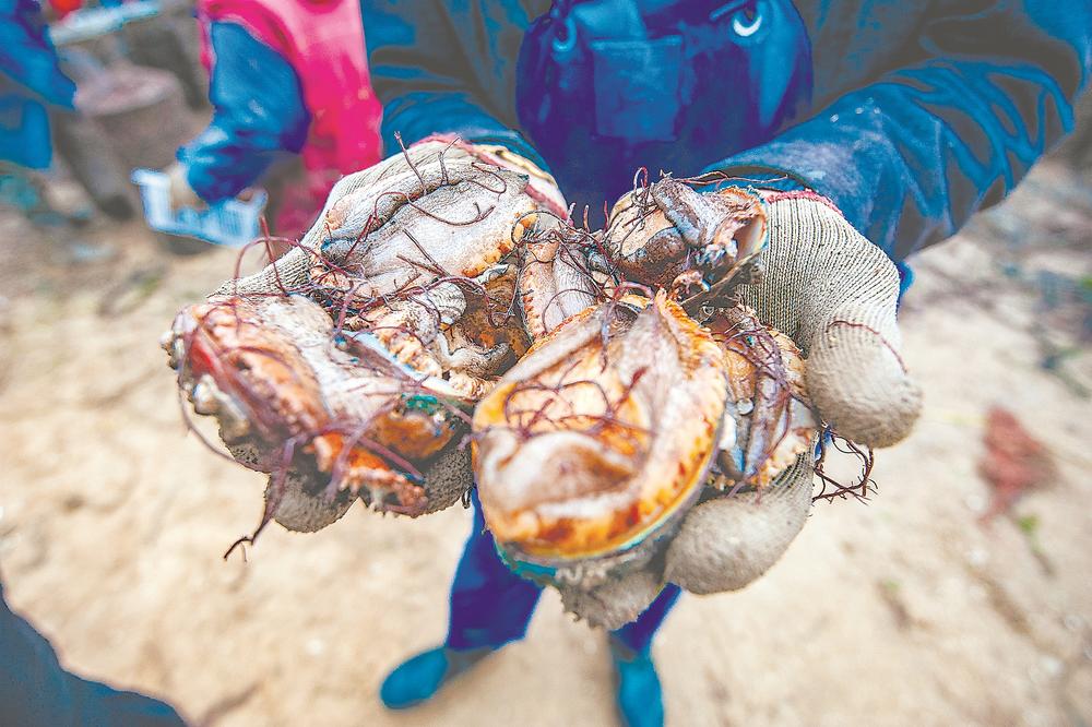据实验区农业农村发展服务中心高级工程师周小文介绍,平潭四面环海,周边海域水质良好,潮流流速高,水质清澈透明,水温、海水盐度等条件适宜。不仅如此,这片海域海藻资源同样丰富,包括紫菜、海带等,为鲍鱼提供新鲜、充足的“口粮”。“这使得平潭鲍鱼长得又快又好,大约12个月至18个月就可以收成。”