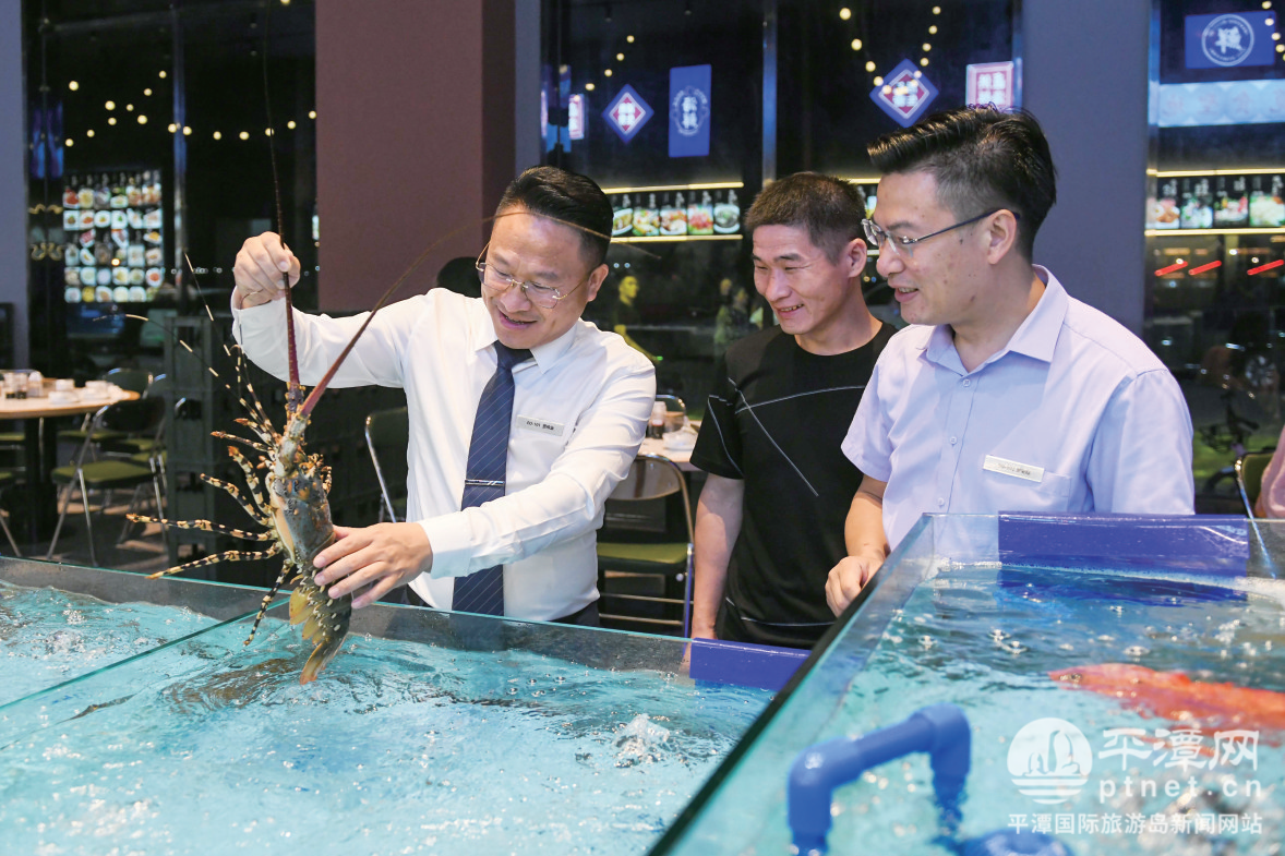 68海鲜码头餐厅,贾伟业(左)给客人展示鲜活的龙虾