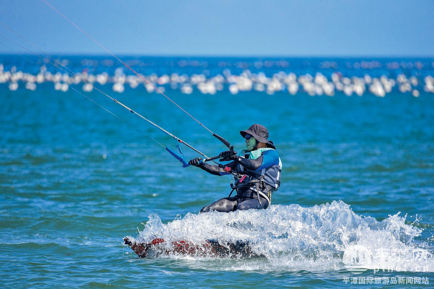 向海而行,在五星金沙滩上,不少穿戴着专业设备的风筝冲浪好手在海浪中拉着绳索,熟练地操作风筝快速前进。阿彪说,风筝冲浪运动对风力要求较高,平潭的风况很适合该运动的开展,而五星金沙滩因其洁净、海域宽阔的特点,成为了国内外风筝冲浪爱好者的绝佳训练地。