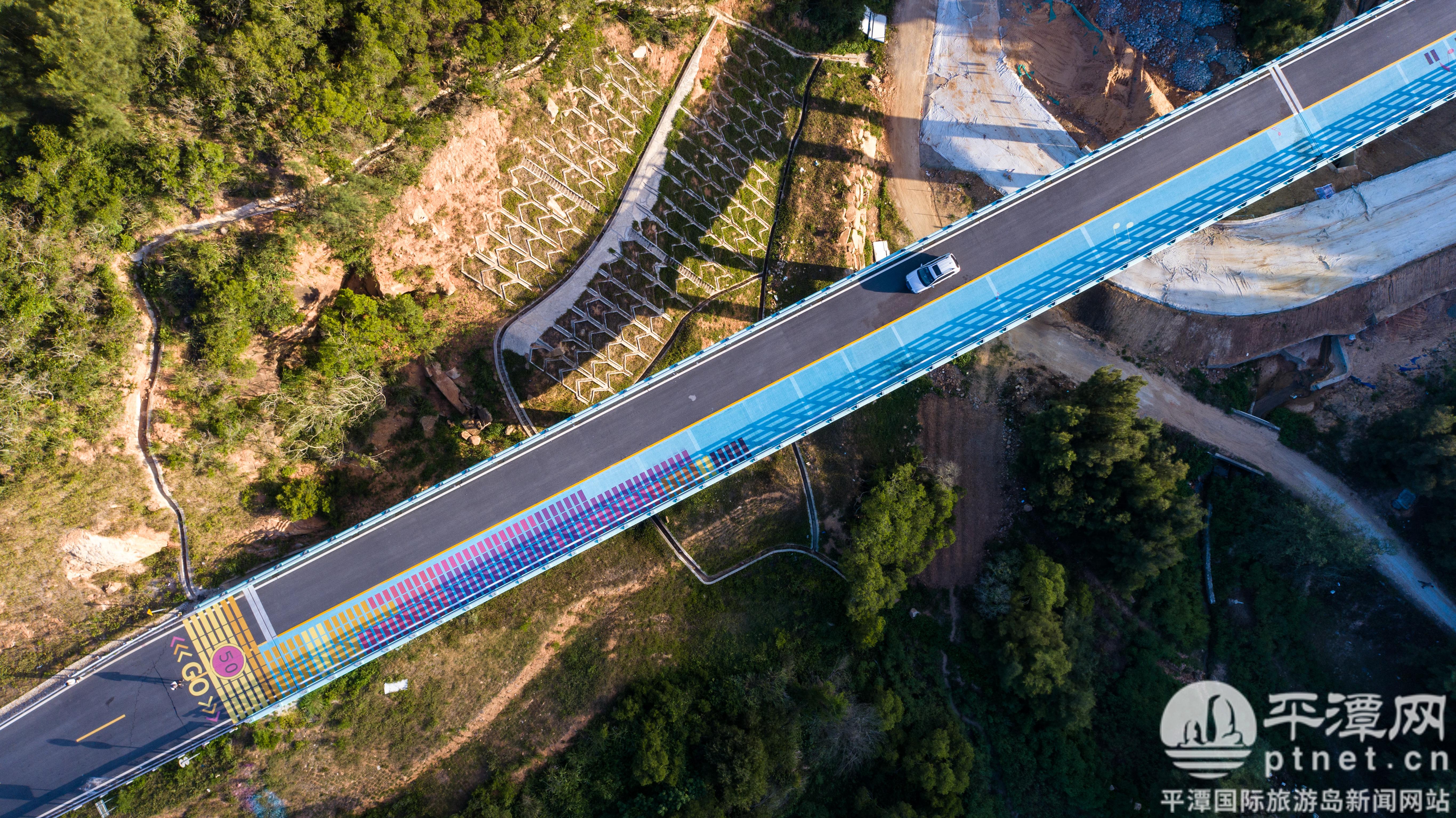 在北部生态廊道榕山大桥段,一段总长500米的彩绘公路犹如美丽的丝带缠绕在山海之间,当车辆行驶而过,公路便启动播放模式,奏响《茉莉花》的旋律。