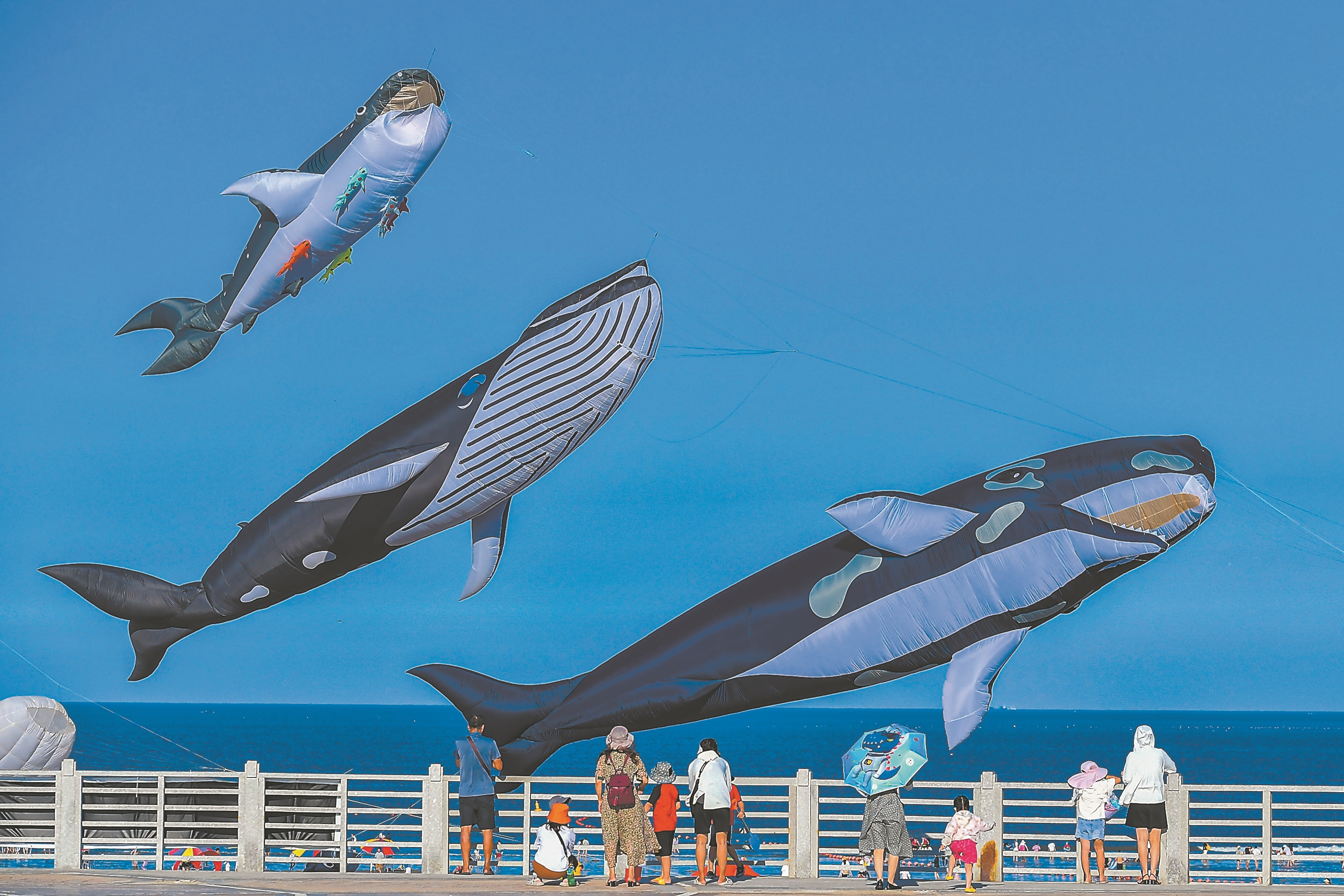 沙滩风筝节上,鲸鱼风筝从海面“跃起”,让游客欣喜、惊叹。