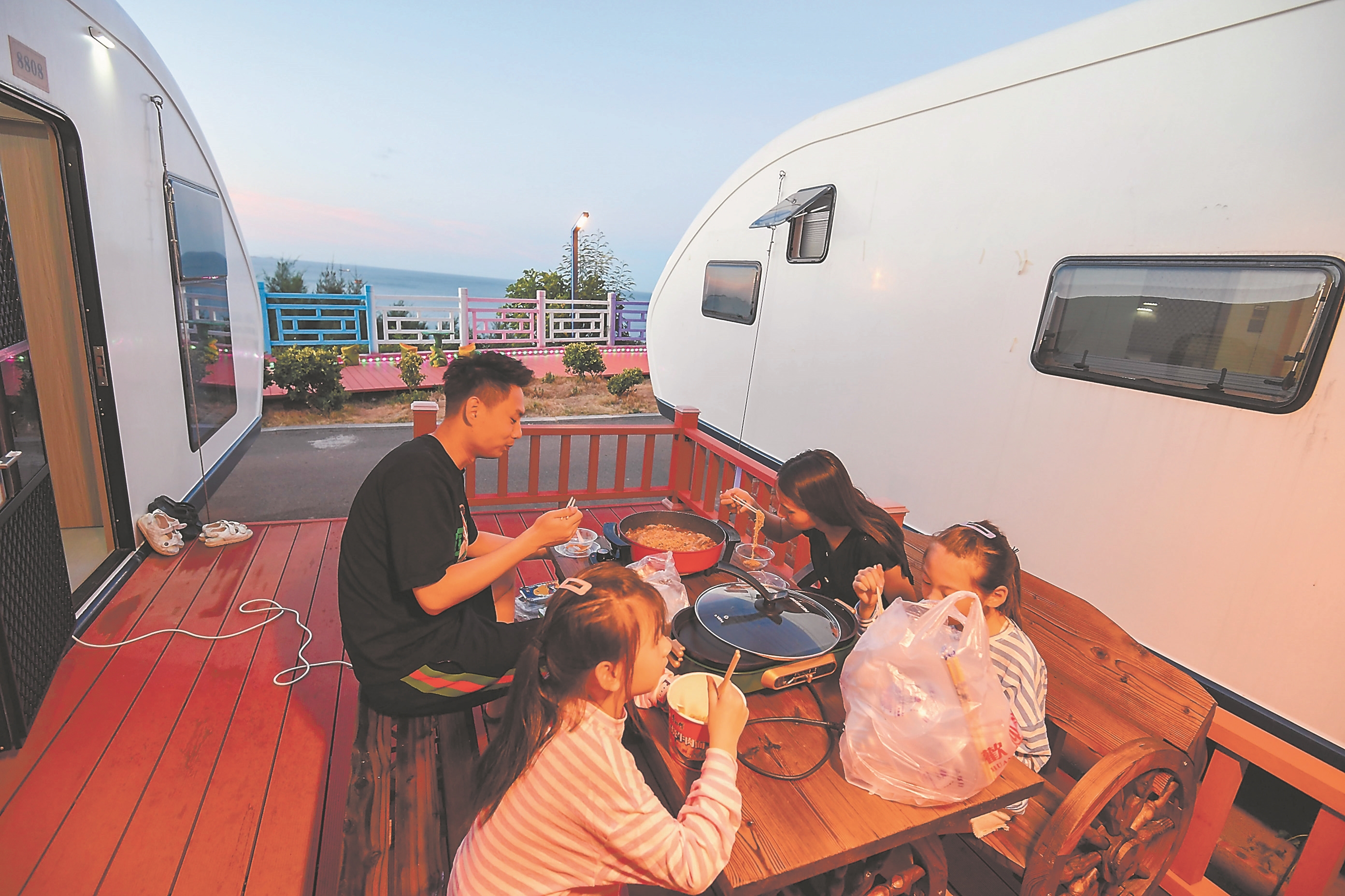 暑期,房车订单火爆。瞧这一家子,在房车外边吹海风边吃火锅。