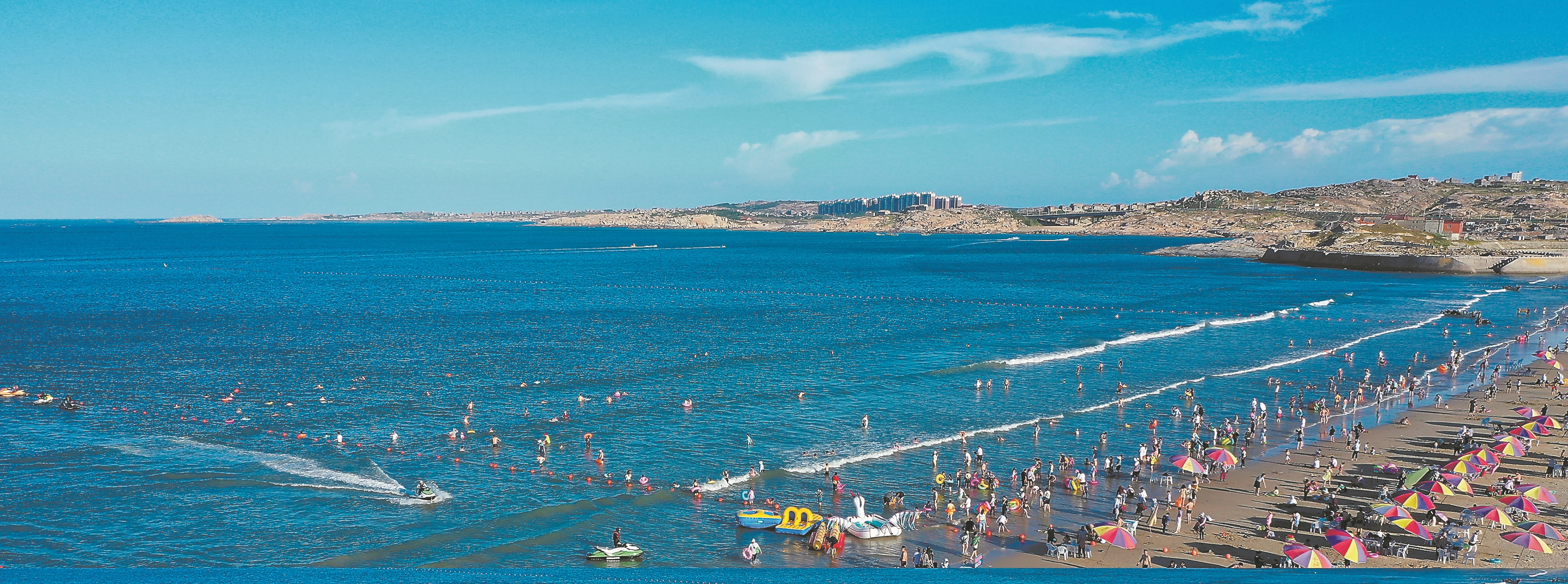 蓝天、碧海、沙滩让人乐而忘返。正值旅游旺季,龙王头海滩热闹极了。
