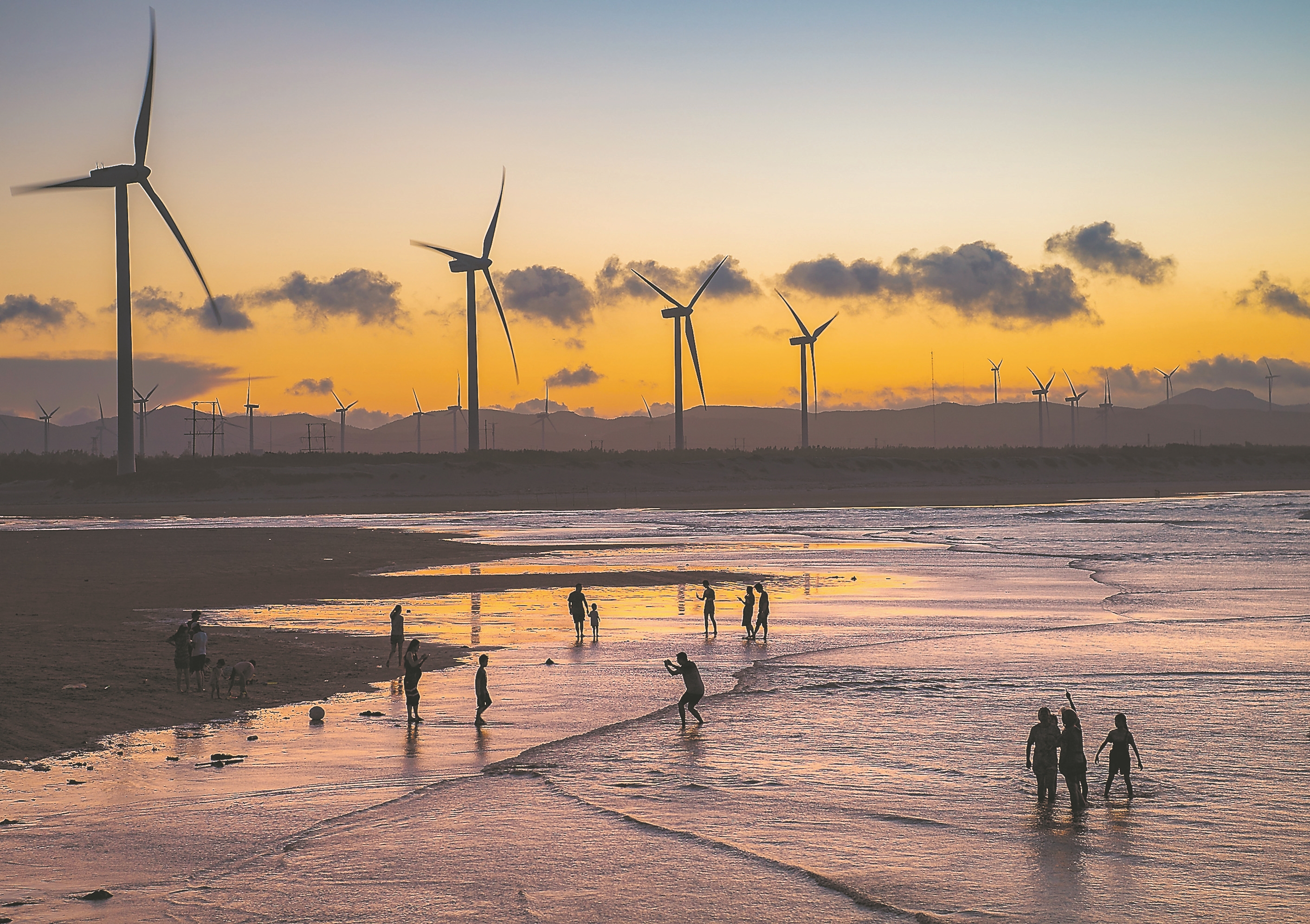 长江澳风车田,一座座风车高高耸立在沙滩上,夕照下形成一幅绝美的图画。