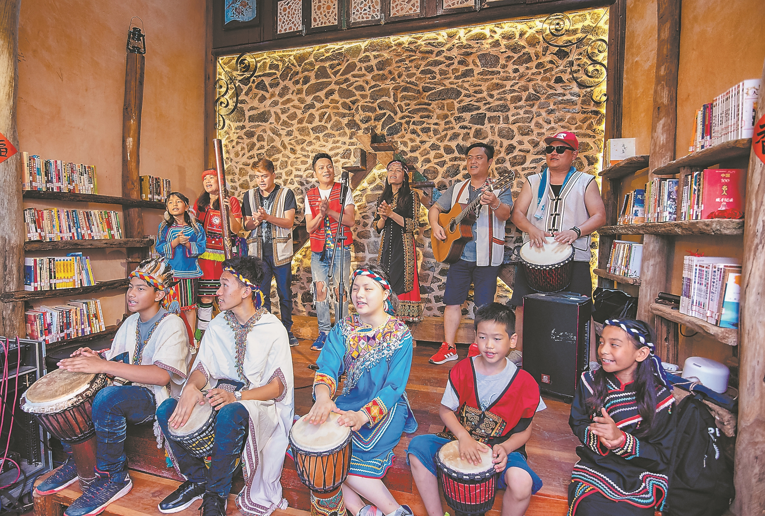 北港村一家石厝改造的民宿中,台胞为游客演绎原创曲目《让风带走我》。
