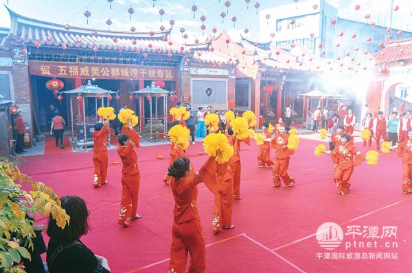 当天,刻着“平潭古迹”的五福庙辕门前,信众们载歌载舞。城隍殿前,香火旺盛,热闹非凡。平潭五福庙又名威灵公庙,原称驻镇都城隍庙,是福建省省级文物保护单位,有两百余年历史。它始建于明代,在清代康熙、乾隆年间又续建,而后经过多次修缮。