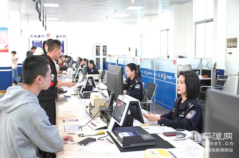 实验区公安局海坛中心窗口民警正在为市民办理业务。
