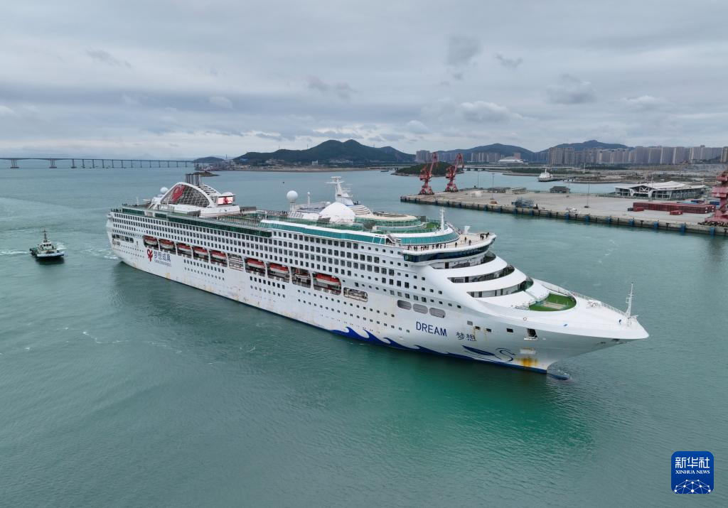3月6日,“梦想”号国际邮轮离开平潭国际邮轮中心码头(无人机照片)。