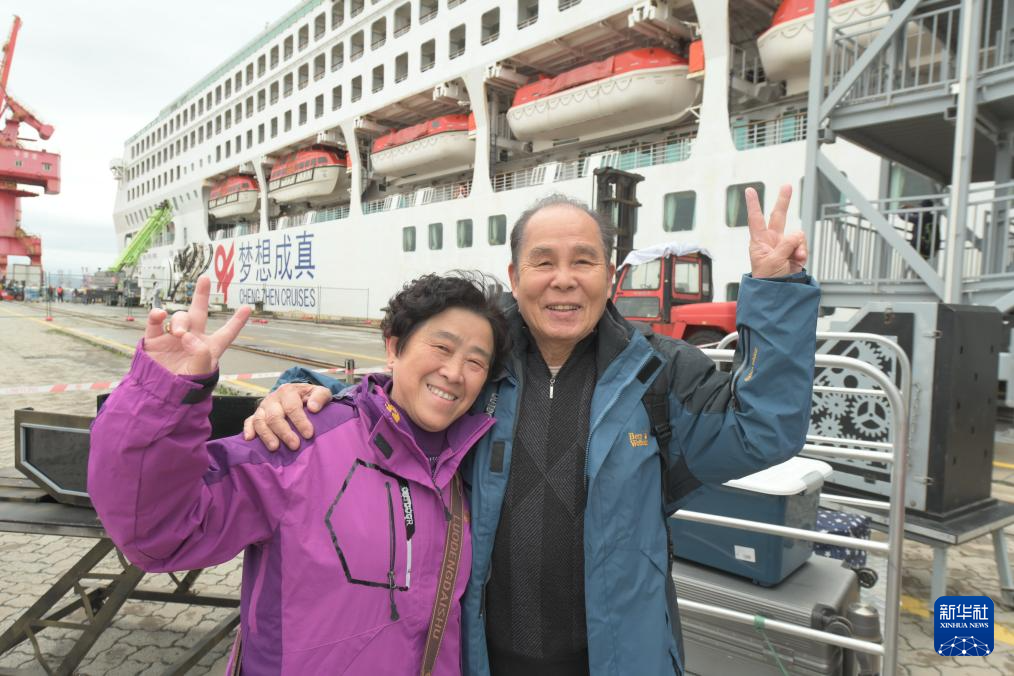 3月6日,搭乘“梦想”号国际邮轮的旅客登船前在码头拍照留念。
