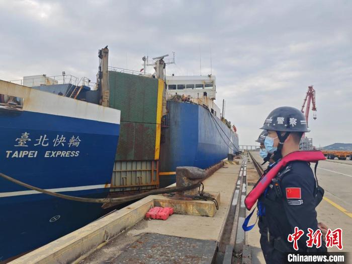 中新网平潭4月23日电 (白志斌)4月23日8时许,满载台湾农渔产品等542吨货物的“台北快轮”从台北港顺利抵达平潭金井港区,平潭出入境边防检查站移民管理警察靠前服务,“一站式”办理船舶和人员入境边检手续,保障货物“抢鲜上市”。