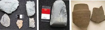 2004年,壳丘头遗址发掘文物,左起为石锛、石器、陶器