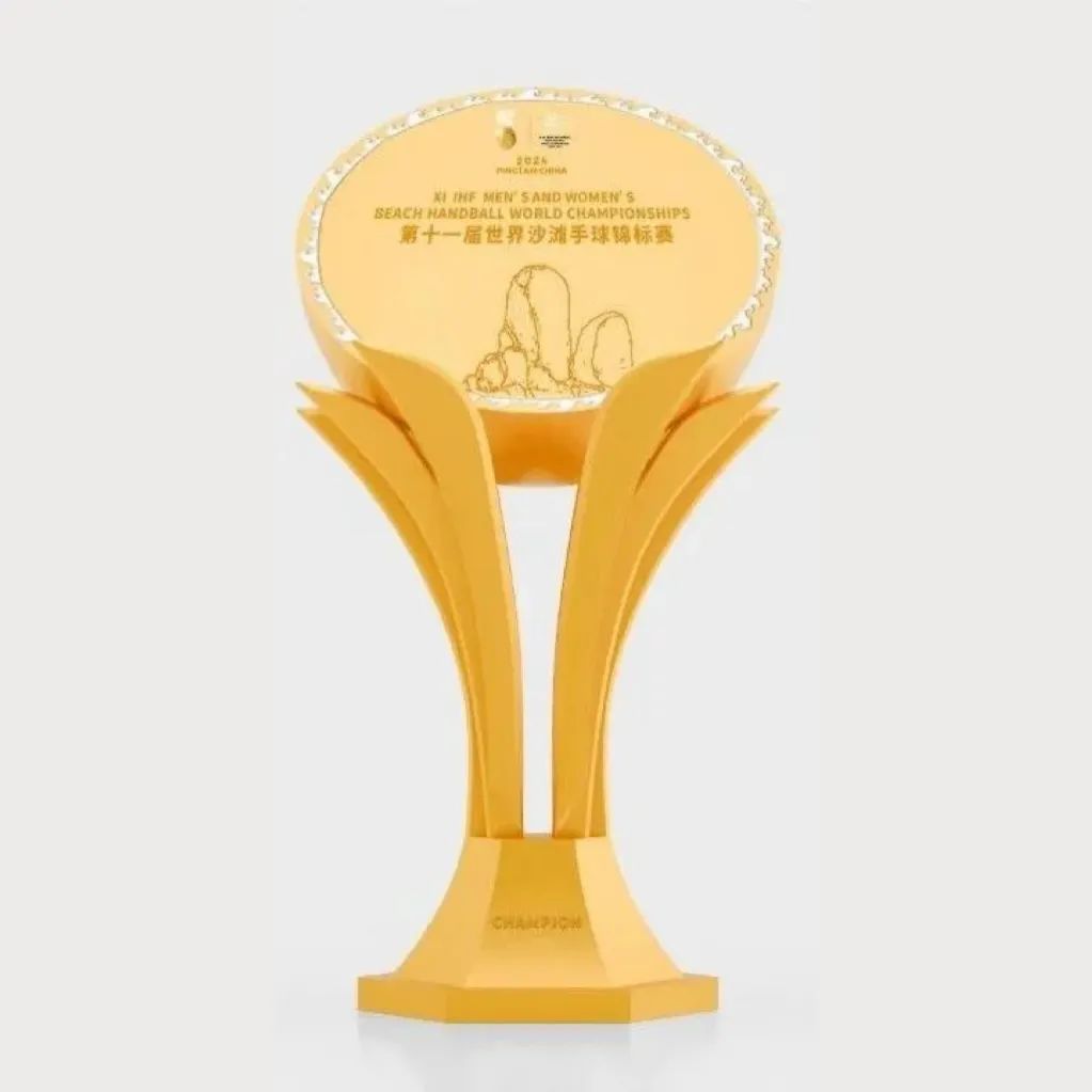 奖杯顶部,精心雕琢的沙滩手球剖面,不仅展现了这项运动的魅力核心,更创新性地融入了平潭地标——石牌洋的剪影,这一设计不仅让奖杯更具地域特色,也将平潭的美丽景致深深印在每一位参赛者的心中。