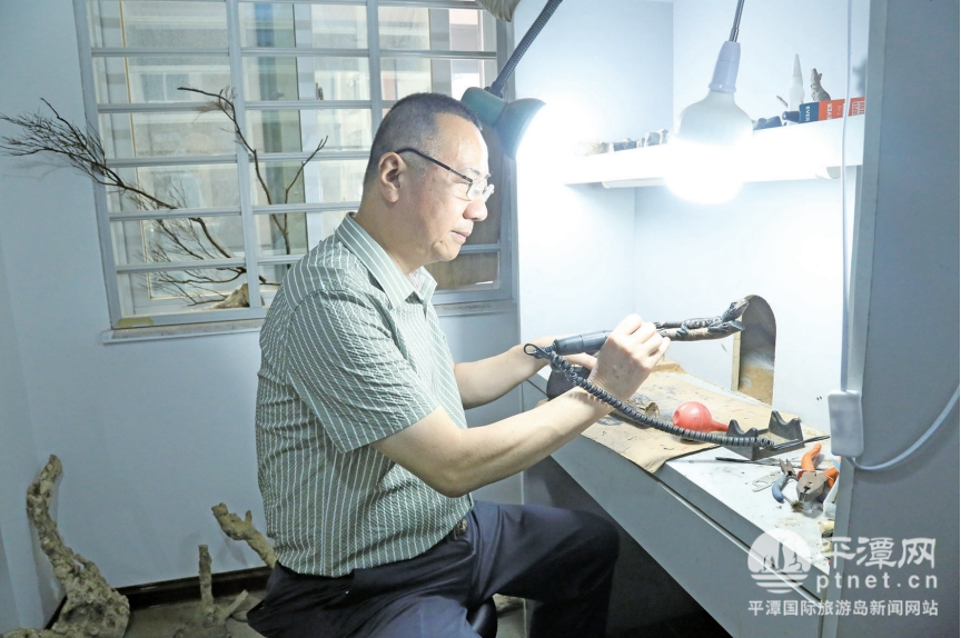 多年来,施孝斌一直在精进雕刻技艺,他不断地从平潭、福州等地的老艺人身上汲取创作灵感和经验。他在传统海柳雕刻的基础上,大胆创新,因形施艺,融合牙雕、玉雕、木雕和石雕等雕刻技艺。