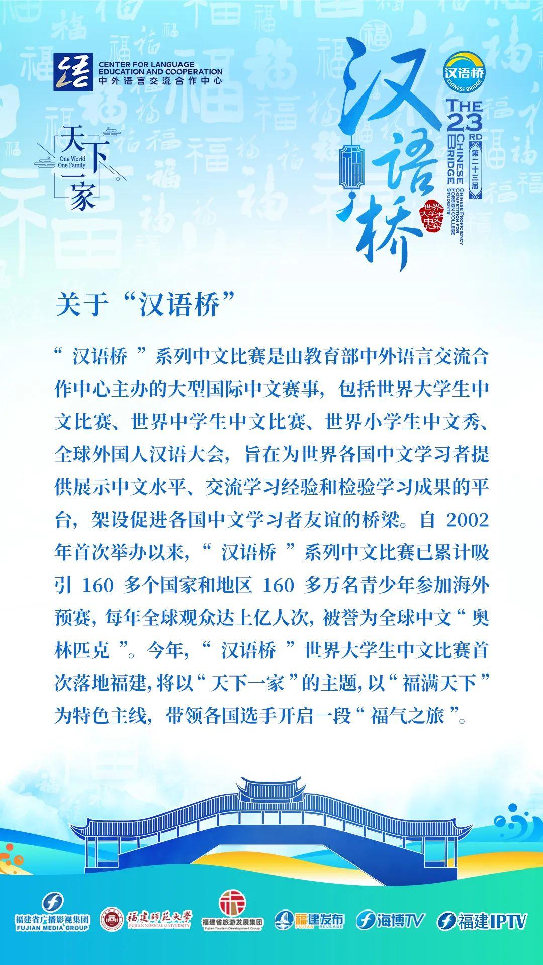 活动开场,首先通过以“桥见五福”为主题的先导片,对本届“汉语桥”比赛进行全程回顾。紧接着全球30强选手共同亮相,5名洲冠军融合福建各地非遗表演,说出自己的参赛宣言。在选手们倾情唱响的《汉语桥》歌声中,总决赛拉开了帷幕。