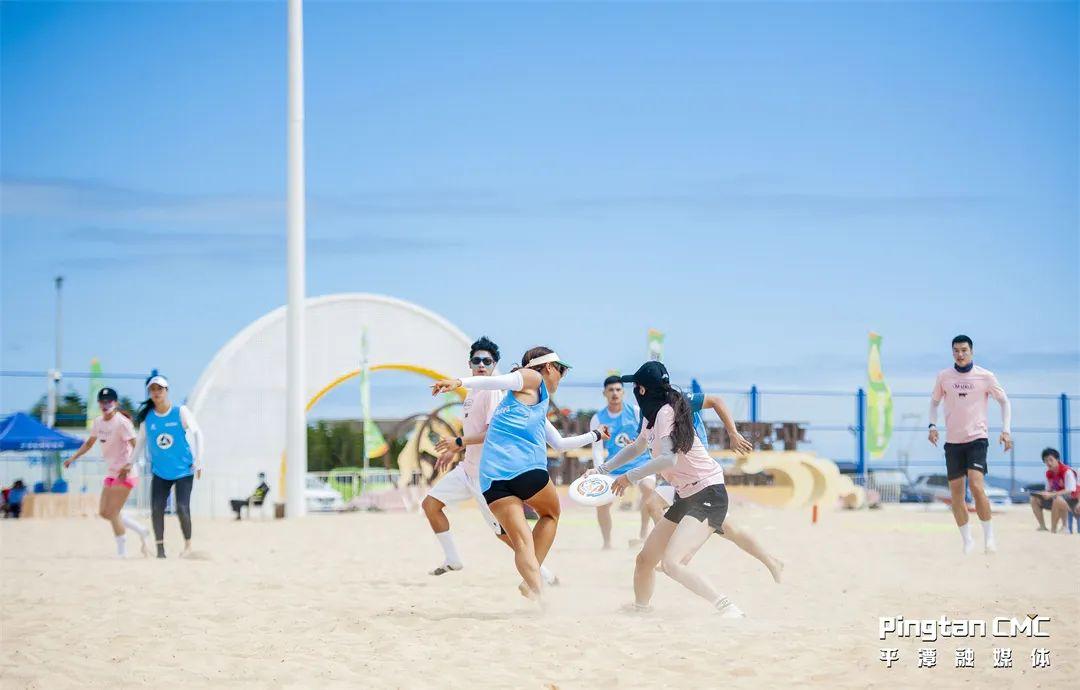 漫步海边,一块平整的沙滩运动场地内,不少年轻人在玩沙滩排球、投掷飞盘。他们的脚上沾满沙子,脸上满是笑容。