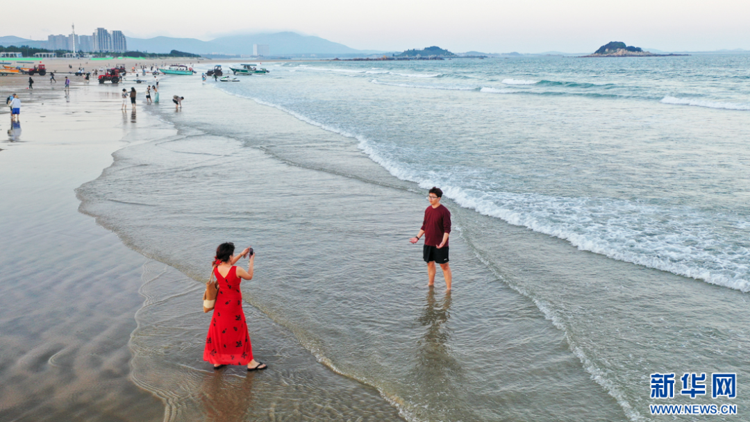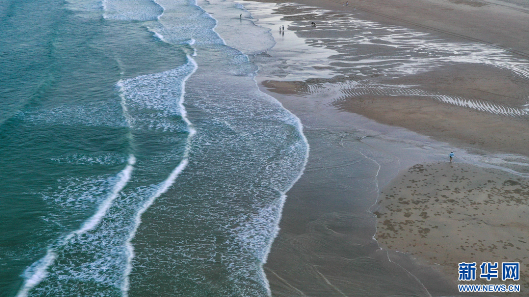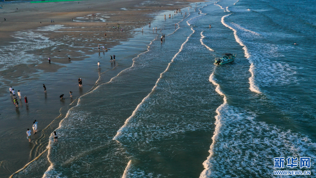 这是傍晚时分的龙王头海洋公园海滩,凉风习习,浪花轻柔,游客流连忘返(10月14日摄,无人机照片)。新华网 肖和勇 摄