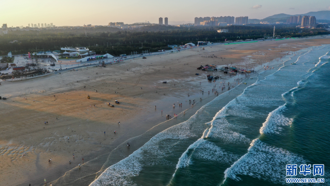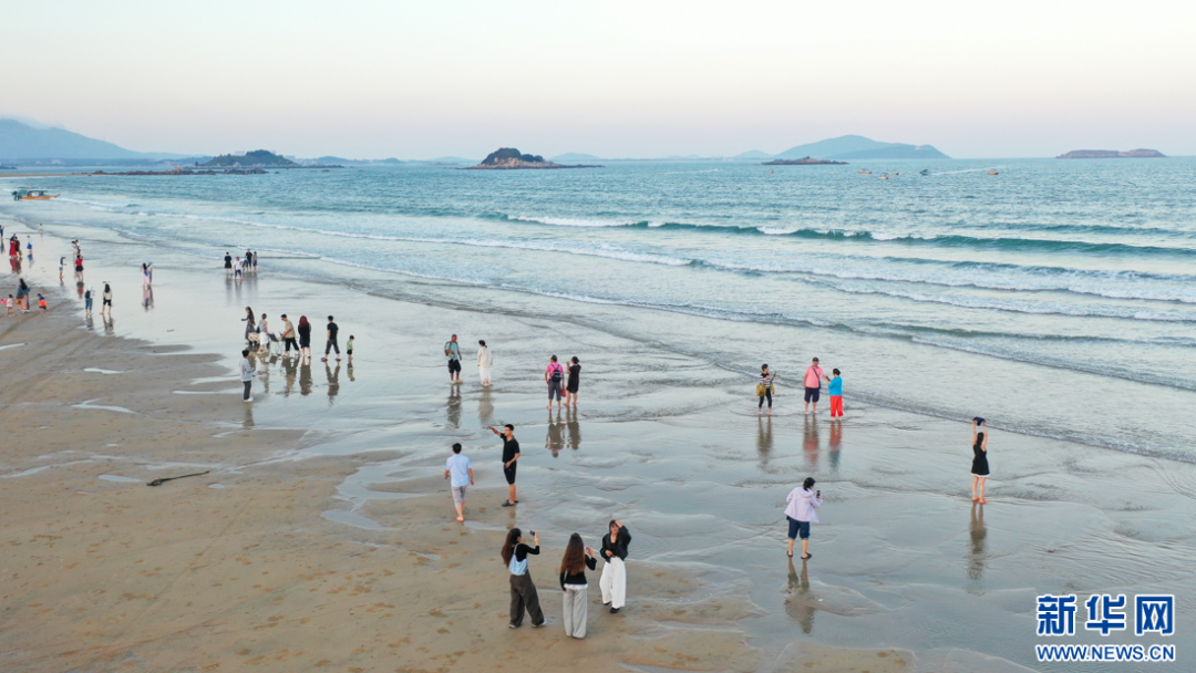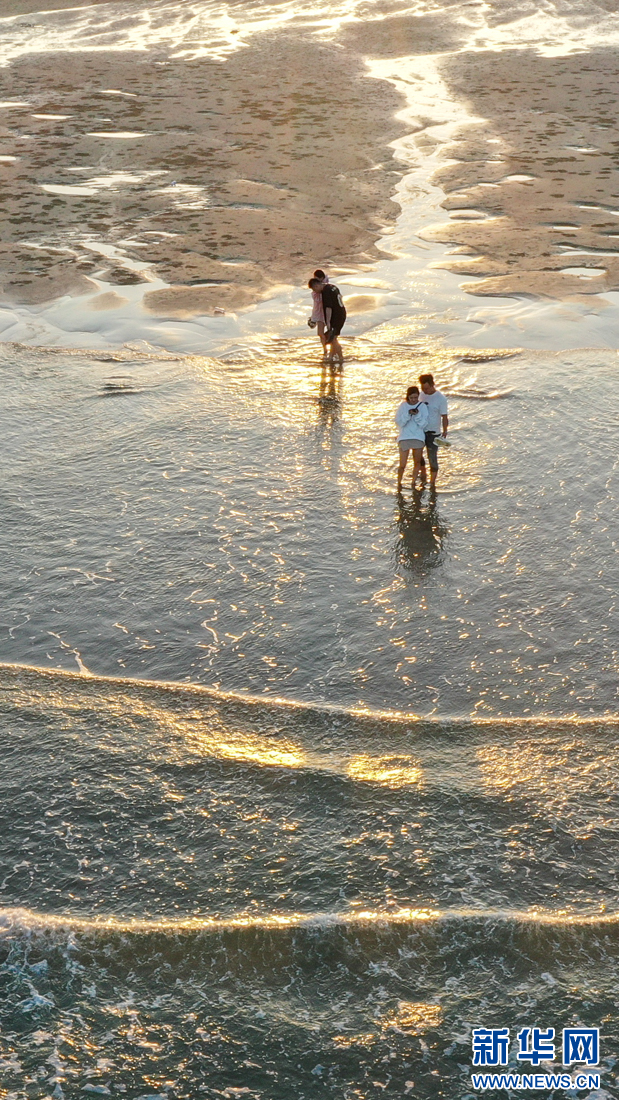 游客在沙滩上游玩,尽享落日海岛风情(10月14日摄,无人机照片)。新华网 肖和勇 摄