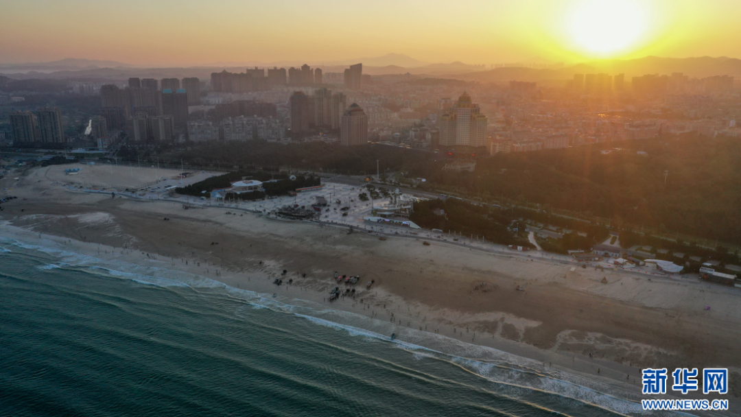 10月14日,落日余晖洒满金色沙滩(无人机照片)。新华网 肖和勇 摄