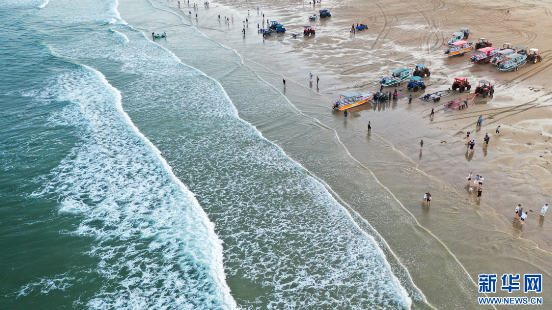 游客在金色沙滩上游玩(10月14日摄,无人机照片)。新华网 肖和勇 摄