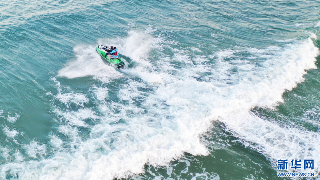傍晚时分,游客乘船冲浪(10月14日摄,无人机照片)。新华网 肖和勇 摄