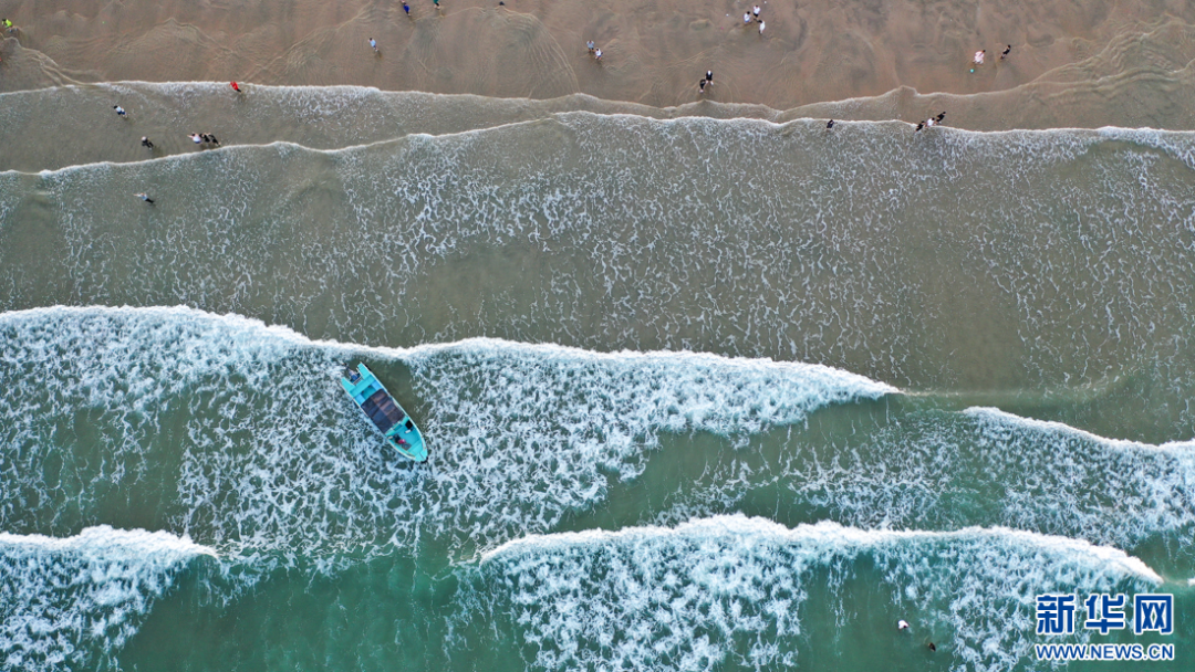 这是傍晚时分拍摄到的浪花、小船与游客(10月14日摄,无人机照片)。新华网 肖和勇 摄
