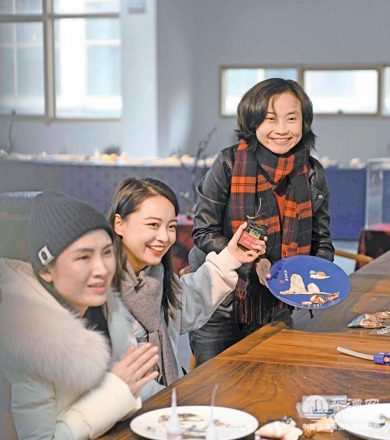 真人秀节目《好物好风光》第2季走进平潭,王佩琳(右一)在节目中介绍平潭贝雕。(资料图)