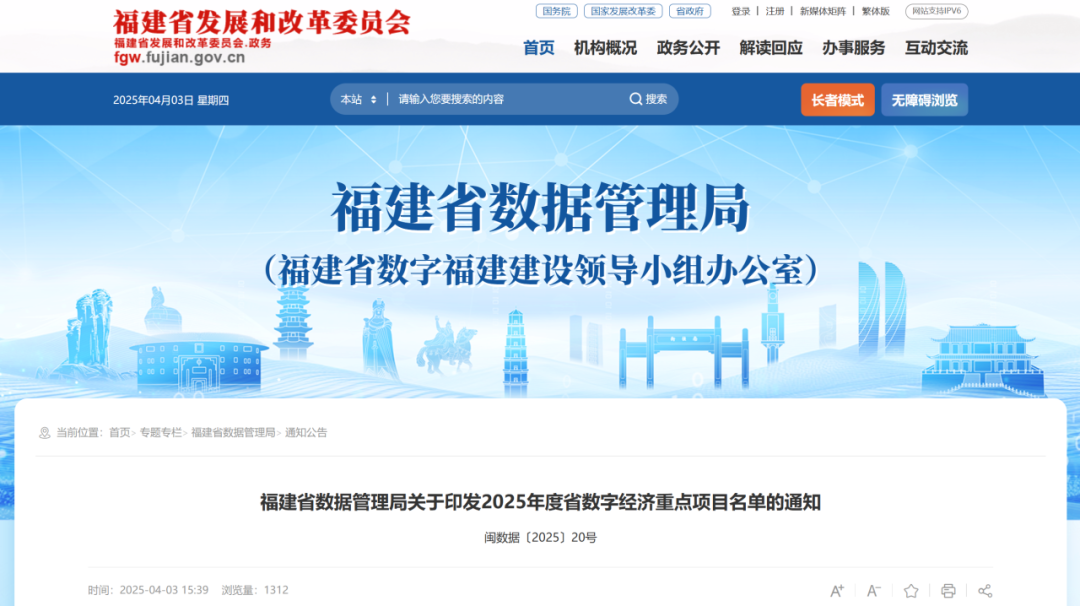 为落实省政府印发的《福建省加快推进数字化全面赋能经济社会高质量发展总体方案》,着力打造更具竞争力的数字产业集群,经地方、部门组织申报,我局择优遴选确定2025年度省数字经济重点项目120个、总投资1420亿元,年度计划投资243亿元。现将重点项目名单印发你们,并就有关工作要求如下: