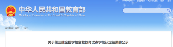根据《教育部办公厅关于开展第三批全国学校急救教育试点工作的通知》(教体艺厅函〔2024〕46号),经学校自主申报、省级教育行政部门遴选推荐、专家复核,教育部拟认定2926所学校为第三批全国学校急救教育试点学校,现予以公示,公示期为2025年5月12日至5月16日。