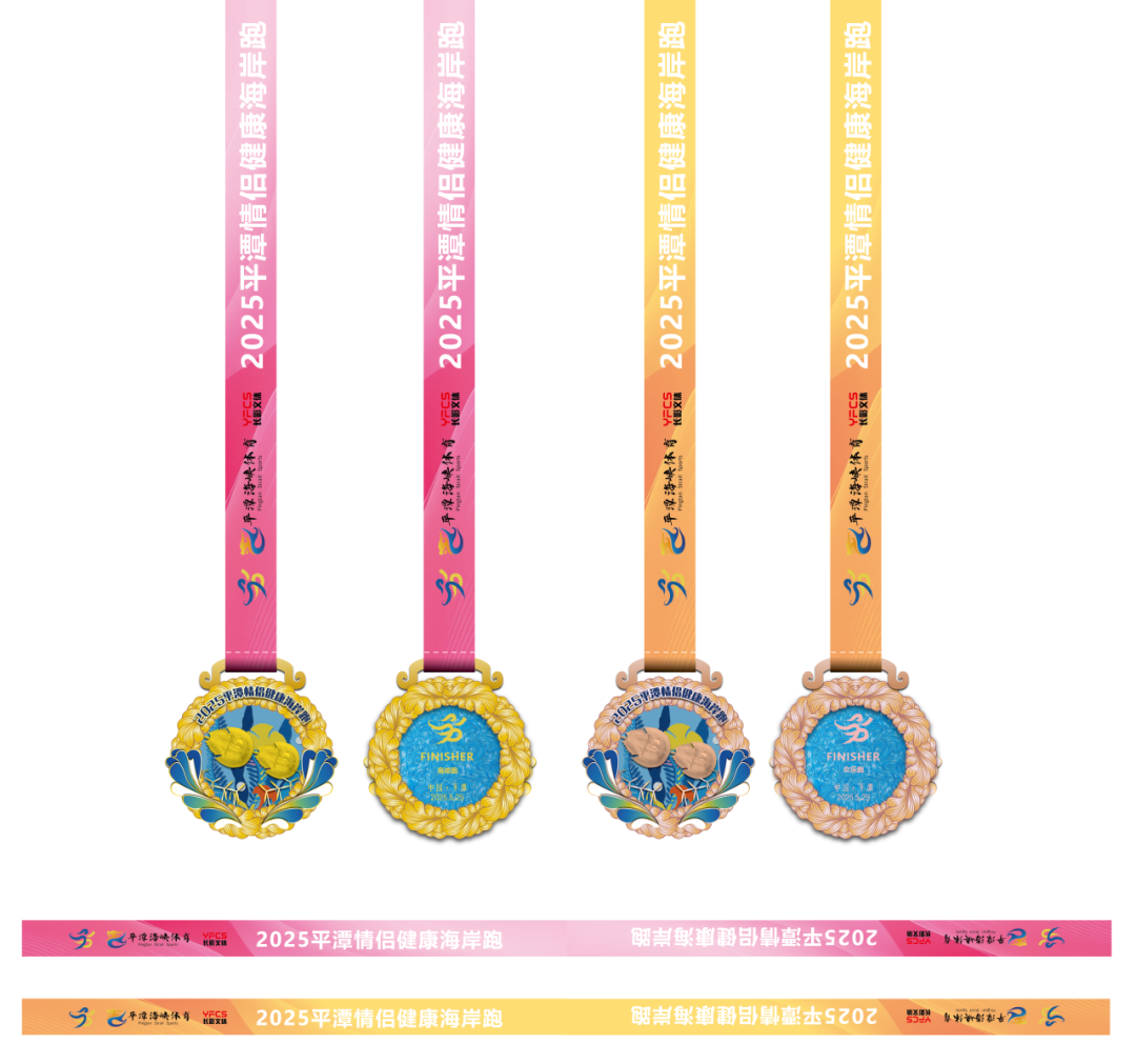 奖牌采用圆形设计,圆形在文化中象征圆满、和谐,契合情侣间的美好情感,也寓意赛事的圆满举办 。边缘以精致的花环造型环绕,花环象征着荣誉与美好,寓意参赛情侣携手收获胜利与幸福。