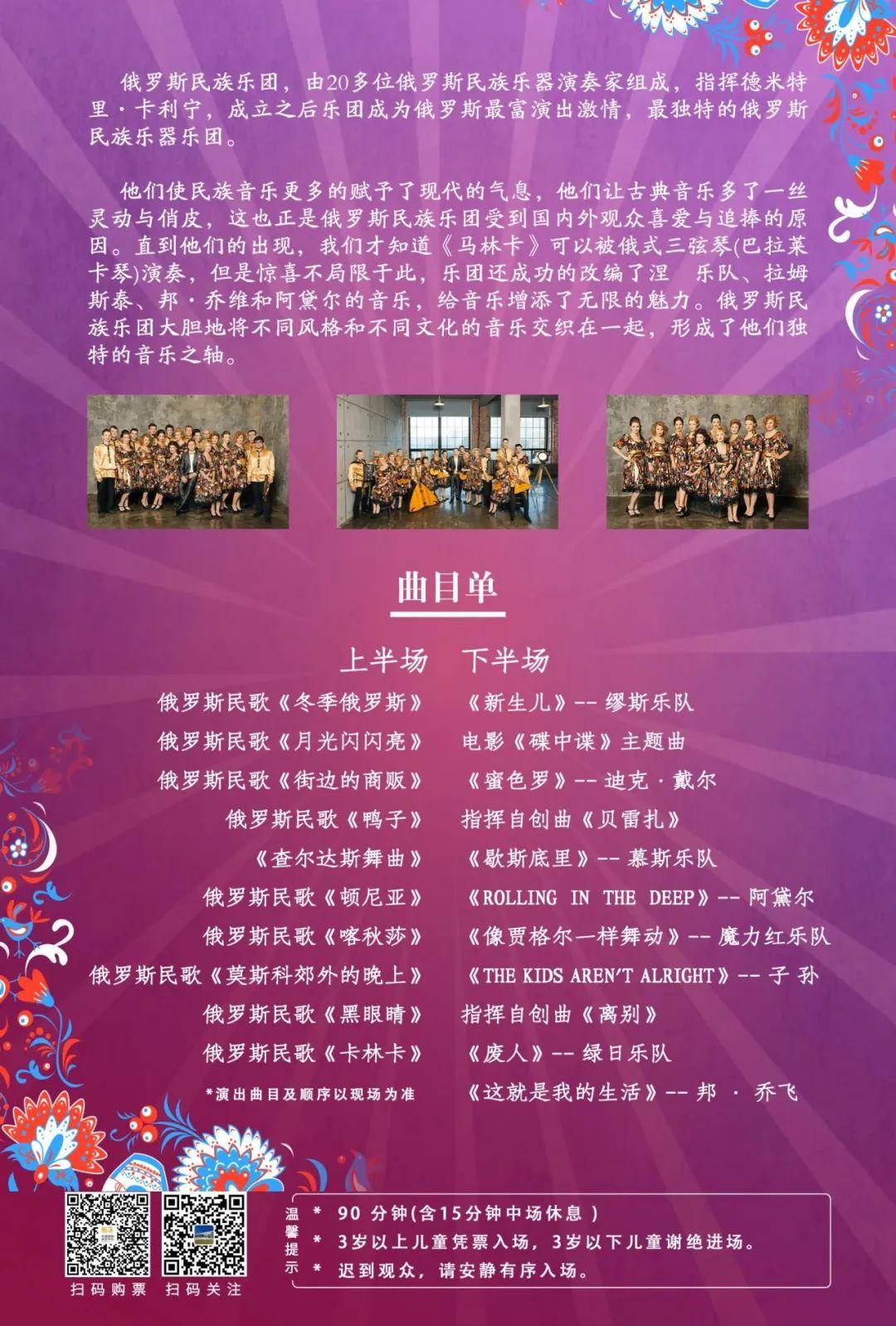 活动内容:俄罗斯民族乐团是一支具有悠久历史和丰富演出经验的乐团,音乐风格独特,融合了俄罗斯民族音乐和现代摇滚音乐的元素。此次音乐会以“民族也摇滚”为主题,展现出俄罗斯民族音乐的魅力和现代摇滚音乐的力量。