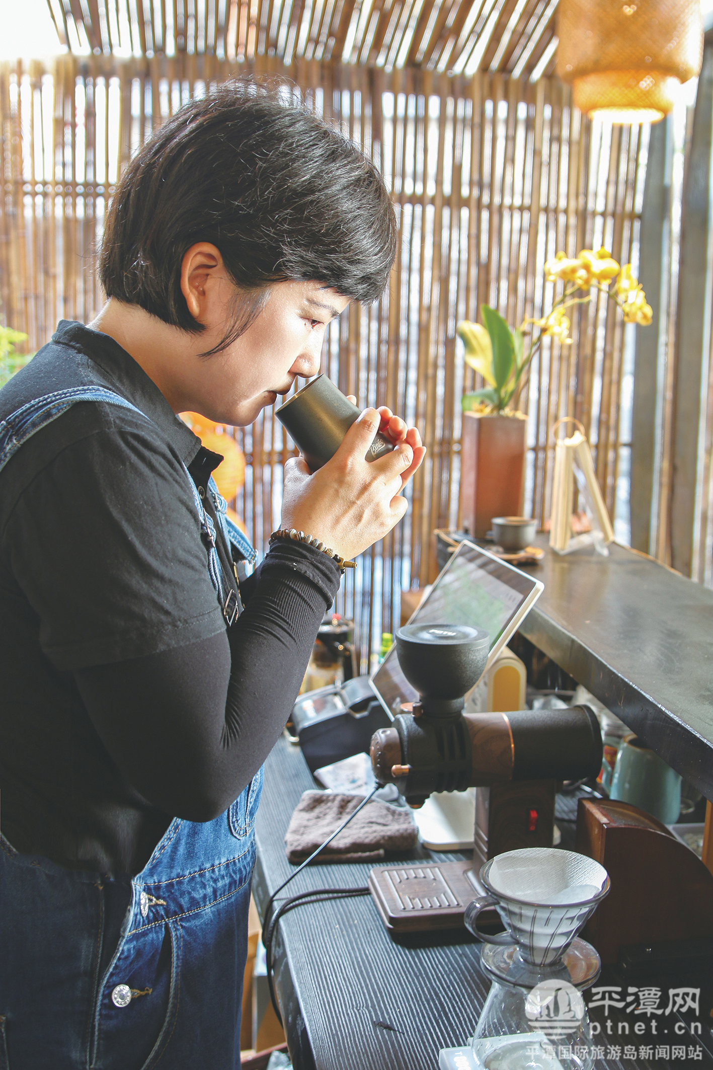 刘舒婷在鉴赏新磨的咖啡粉。