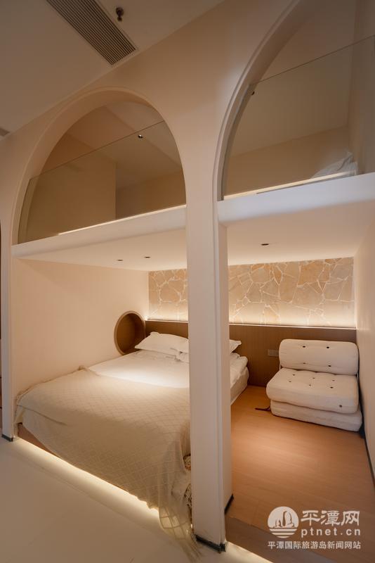 “揽海”“觅海”“叙海”……九陌民宿的每个房间都与“海”有关。“叙海”亲子房是明星房型,是不少举家出游的游客的首选。走进客房,这里看不见冰冷的直角,而是柔和的弧形墙体。“房间复刻了海岛岩洞的原始形态,既呼应平潭传统石厝的厚重感,又注入了现代化设计的灵动层次。”据詹仙富介绍,弧线设计可以避免孩子磕碰,让游客有一种偎依母腹般的安全感。