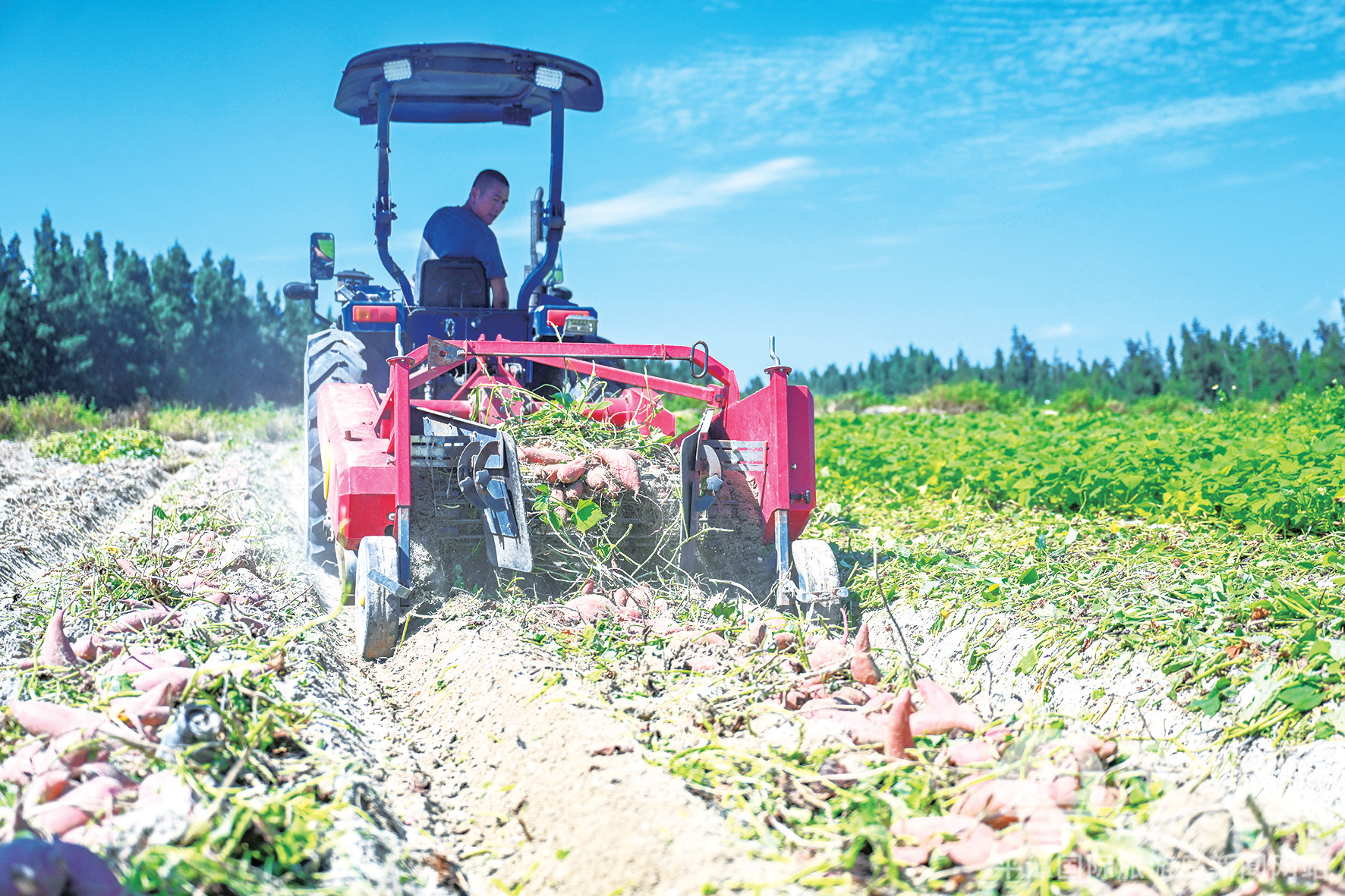 记者在现场看到,甘薯收获机在田间穿梭,一颗颗外表光滑、个头匀称的甘薯破土而出。工人们忙着装袋,准备运往市场。农户陈能勇是平潭绿绿鑫蔬果农民专业合作社股东之一,也是这片农田的主要管理者。