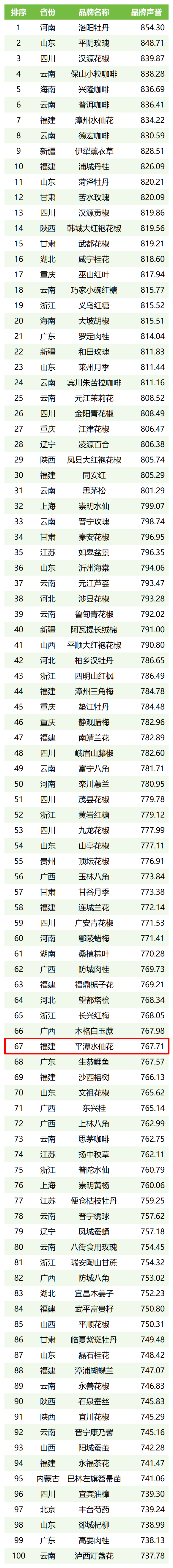 此次福建上榜的12个品牌分别为:漳州水仙花品牌(第7位)、浦城丹桂(第10位、南平)、同安红(第30位、厦门)、漳州三角梅(第44位)、南靖兰花(第47位、漳州)、连城兰花(第58位、龙岩)、福鼎栀子花(第63位、宁德)、平潭水仙花(第67位)、沙西榕树(第69位、漳州)、武平富贵籽(第84位、龙岩)、漳浦蝴蝶兰(第88位、漳州)、永福茶花(第94位、龙岩)。
