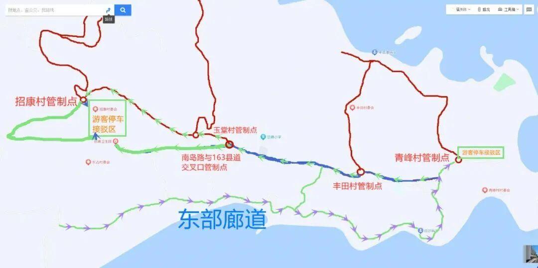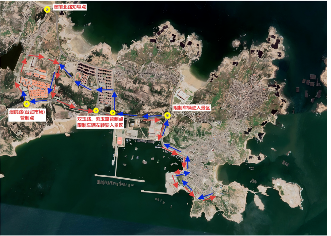 备注:景区村民及民宿、餐饮经营人员出示身份证或者订单可从澳前北路进入管制点,但车辆不得进入68景区内部道路。