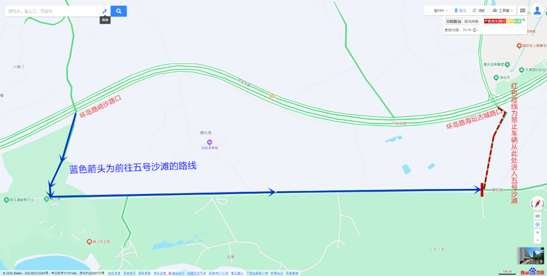 前往“五号沙滩”的车辆,统一从环岛路崎沙路口进入战备路,战备路实行由南往北单向通行,由环岛路磹前路口(环岛路海坛古城路口)驶出;禁止游客车辆从环岛路磹前路口前往五号沙滩。