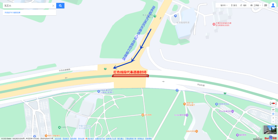 对环岛路“龙王头”路口予以临时封闭,禁止车辆在路口掉头或转弯,从龙凤东路进入环岛路的车辆统一右转进入环岛路;环岛路左转进入龙凤路的车辆统一引导至龙凤荣誉酒店路口掉头,或在环岛—澳前北路路口提前左转