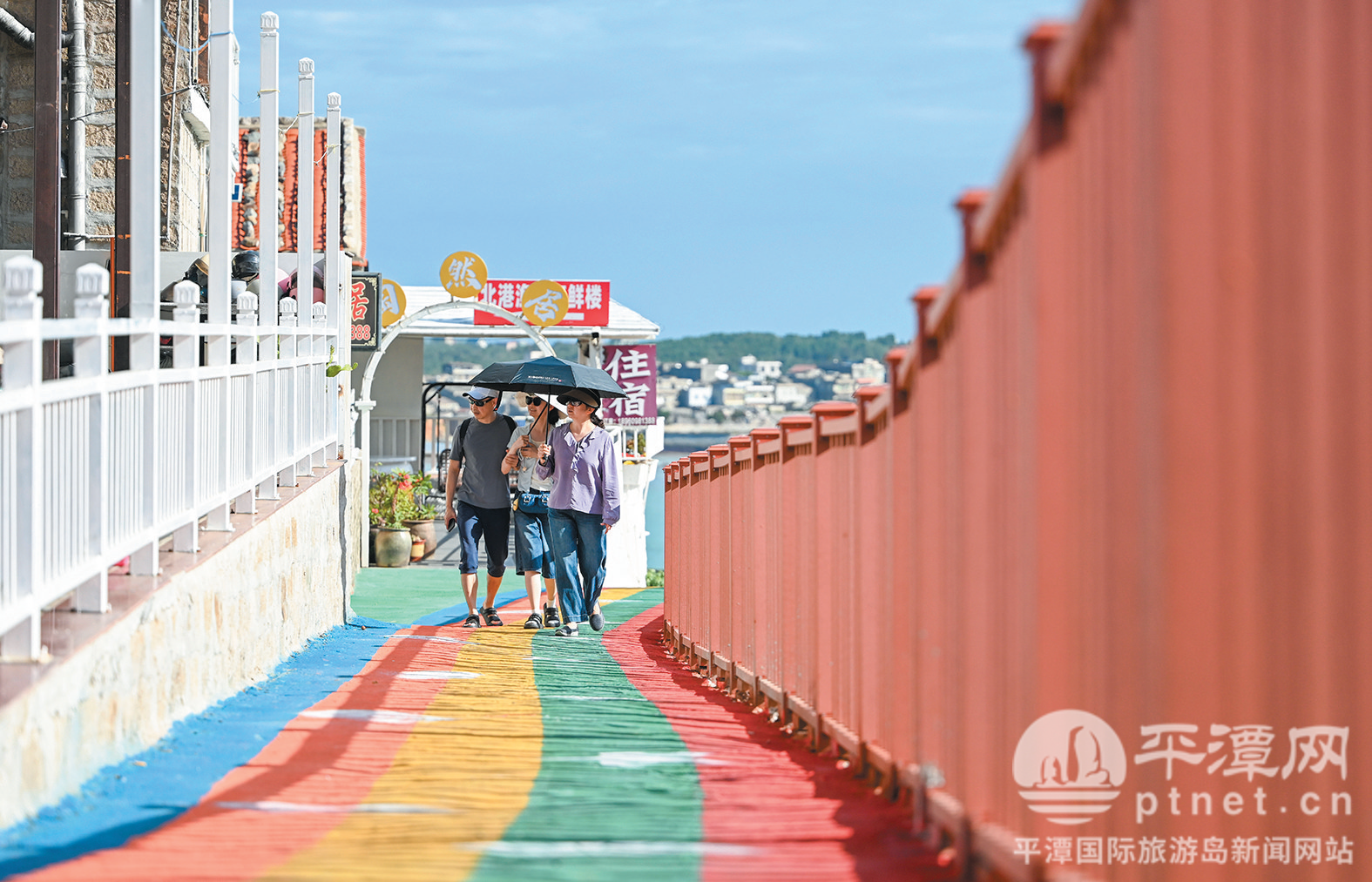 在北港村文创休闲广场,红、黄、蓝三色彩虹步道令人眼前一亮,在阳光的照耀下成为一道靓丽的风景线,吸引许多市民游客拍照打卡。“在彩虹步道拍照真的很出片,后面的海很好看,风格很独特。”来自南京的游客汤思宁说。