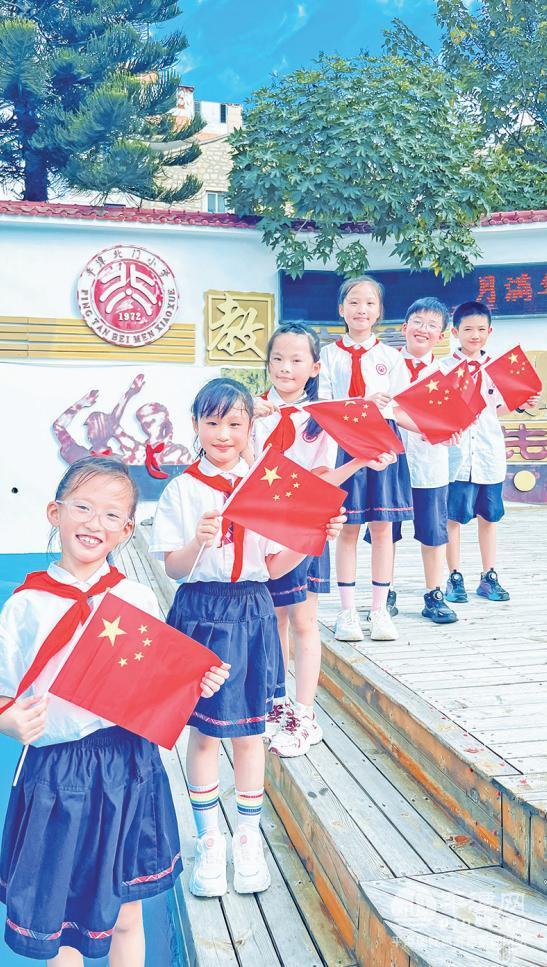 平潭北门小学挥舞五星红旗,表达对祖国的美好祝福。