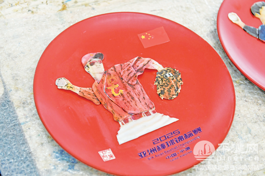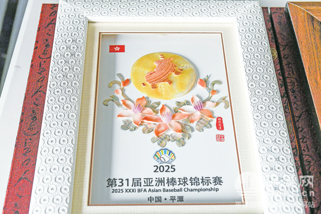 赛事期间,记者来到位于中南村北楼的福建贝雕(平潭)艺术馆,看到了平潭贝雕省级非遗代表性传承人蒋心忠与区级代表性传承人周明为此次亚洲棒球锦标赛创作的三件作品。