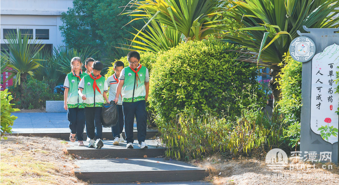 在平潭麒麟小学,少先队员们一起打扫校园内的“百草园”。