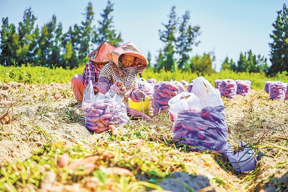 在幸福洋四期盐碱地上,农户忙着收获甘薯。 林君斌 摄